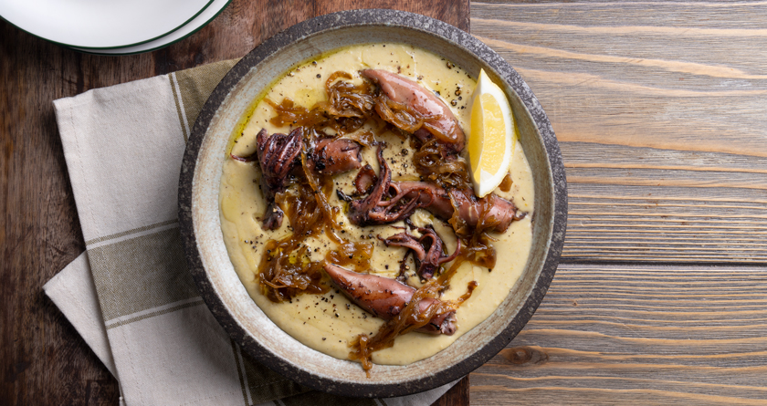 Φάβα με καλαμαράκια και καραμελωμένα κρεμμύδια
